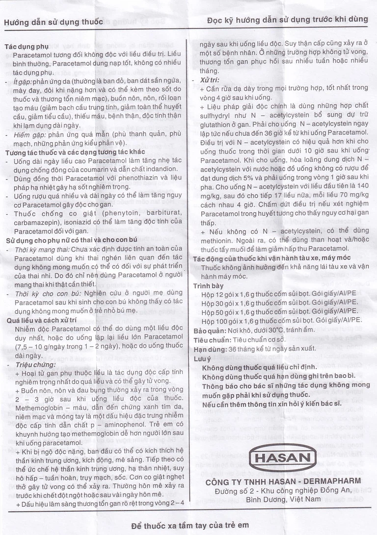 Uống 2 – 4 gói/lần mỗi 4 – 6 giờ, tối đa 16 gói/ngày.