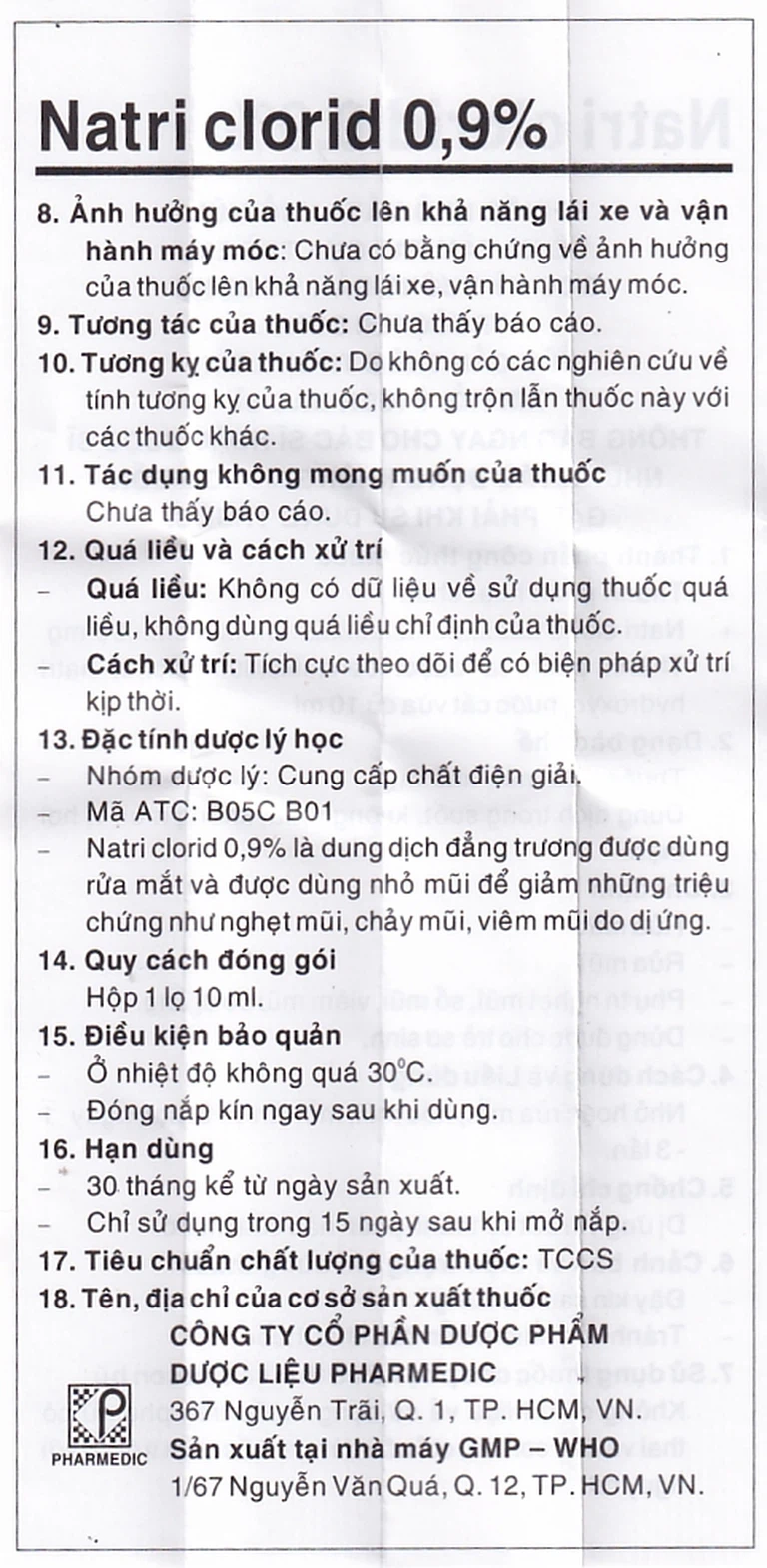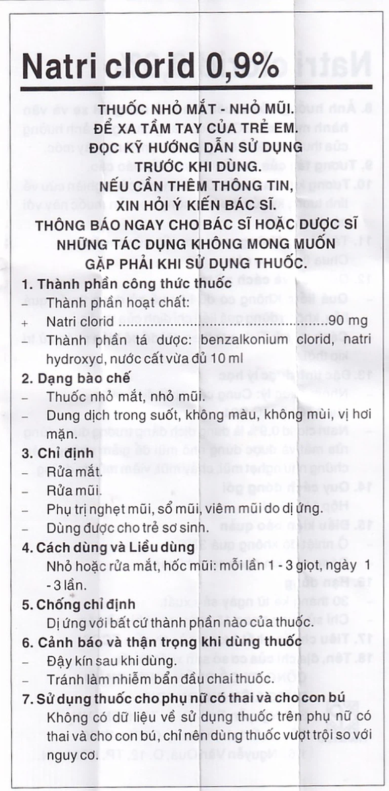 Natri clorid 0,9% là dung dịch đẳng trương được dùng rửa mắt và được dùng nhỏ mũi để giảm những triệu chứng như nghẹt mũi, chảy mũi, viêm mũi do dị ứng.