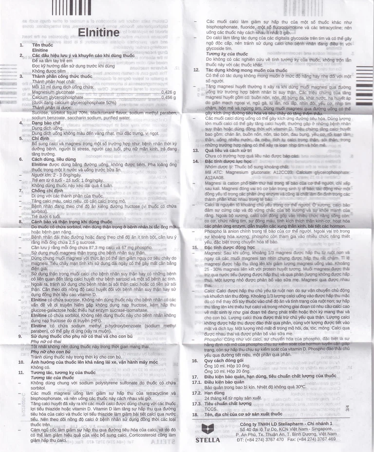 Thuốc Elnitine là sản phẩm của Stella Pharm, có thành phần chính là Calci glyceroposphat, Magnesium gluconate. Đây là thuốc được sử dụng để bổ sung calcium và magnesium trong một số trường hợp như bệnh nhân thời kỳ dưỡng bệnh, người bị stress, người cao tuổi; phụ nữ mãn kinh; trẻ đang tăng trưởng.