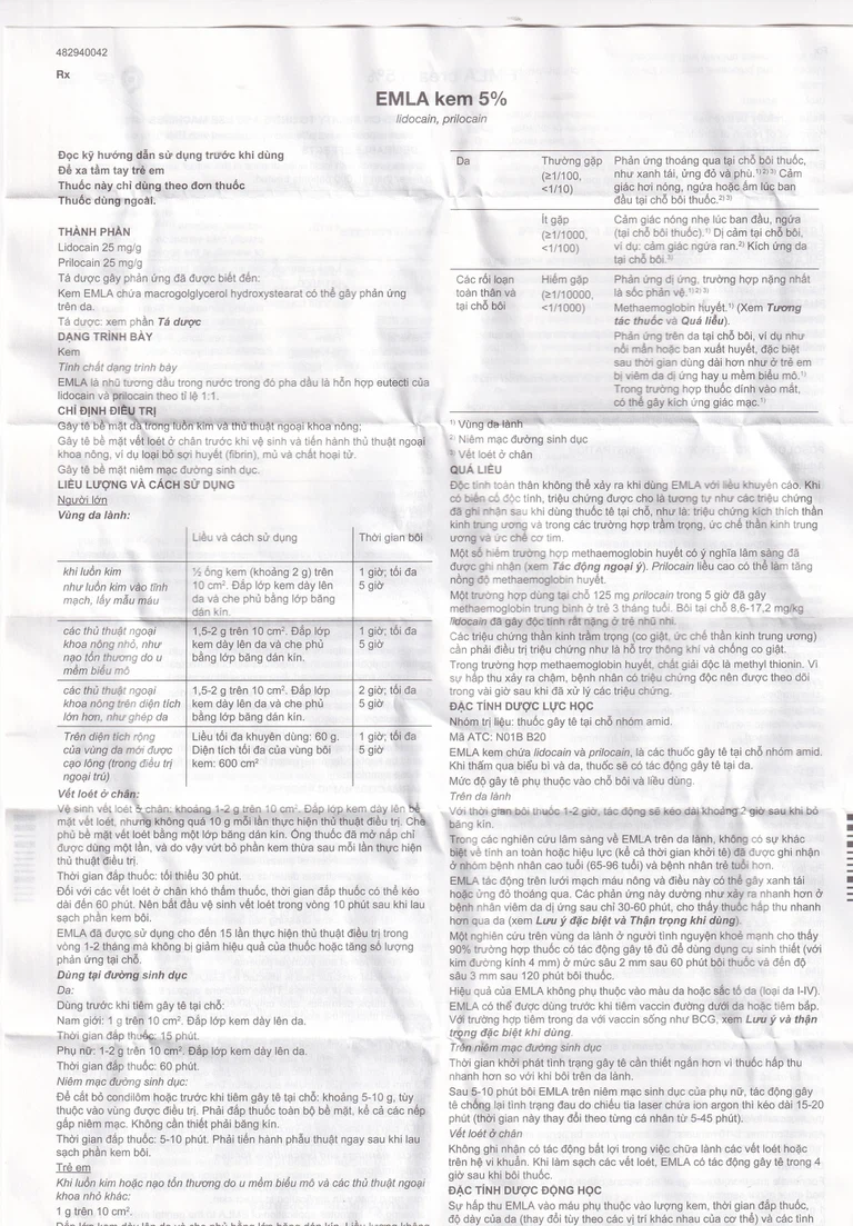 | Khi luồn kim như luồn kim vào tĩnh mạch, lấy mẫu máu | 1/2 ống kem (khoảng 2g) trên 10cm2. Đắp lớp kem dày lên da và che phủ bằng lớp băng dán kín. | 1 giờ; tối đa 5 giờ |
