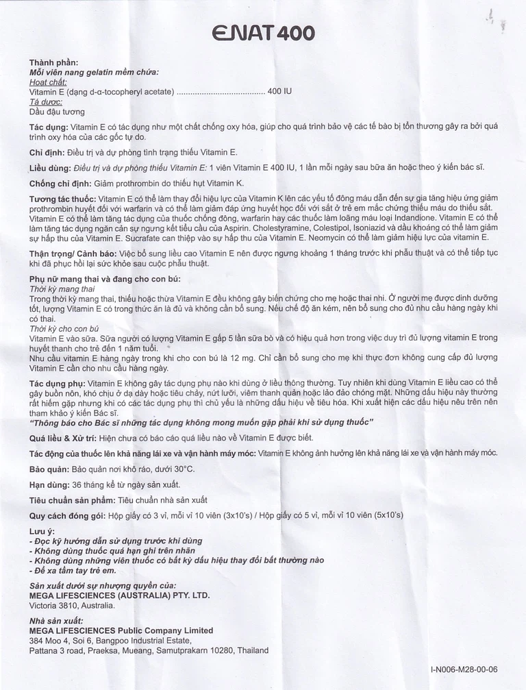 Điều trị và dự phòng thiếu vitamin E: 1 viên vitamin E 400IU uống 1 lần mỗi ngày sau bữa ăn hoặc theo ý kiến bác sĩ.