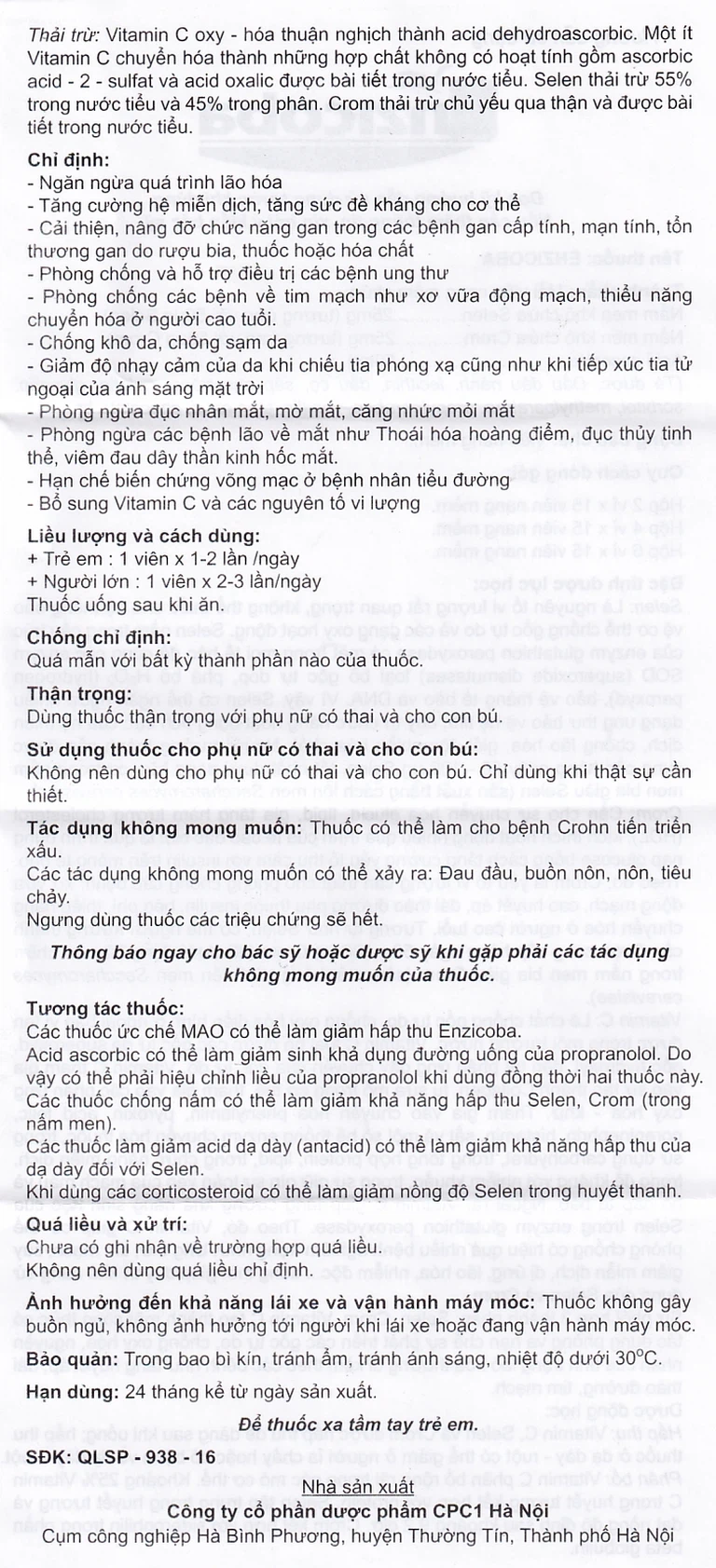 Vitamin C, selen và crom được hấp thu dễ dàng sau khi uống; hấp thu thuốc ở dạ dày – ruột có thể giảm ở người tiêu chảy hoặc có bệnh về dạ dày – ruột. Phân bố: Vitamin C phân bố rộng rãi trong các mô cơ thể. Khoảng 25% vitamin C trong huyết tương kết hợp với protein. Selen tập trung trong huyết tương và đạt nồng độ đỉnh sau khoảng 9,2 giờ. Crom kết hợp với siderophilin trong phần beta globulin.