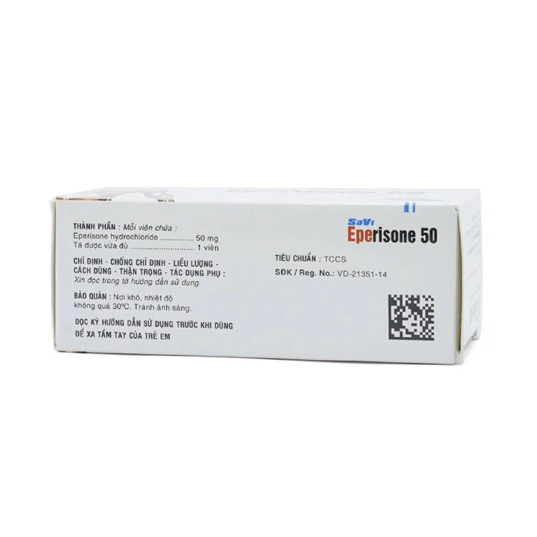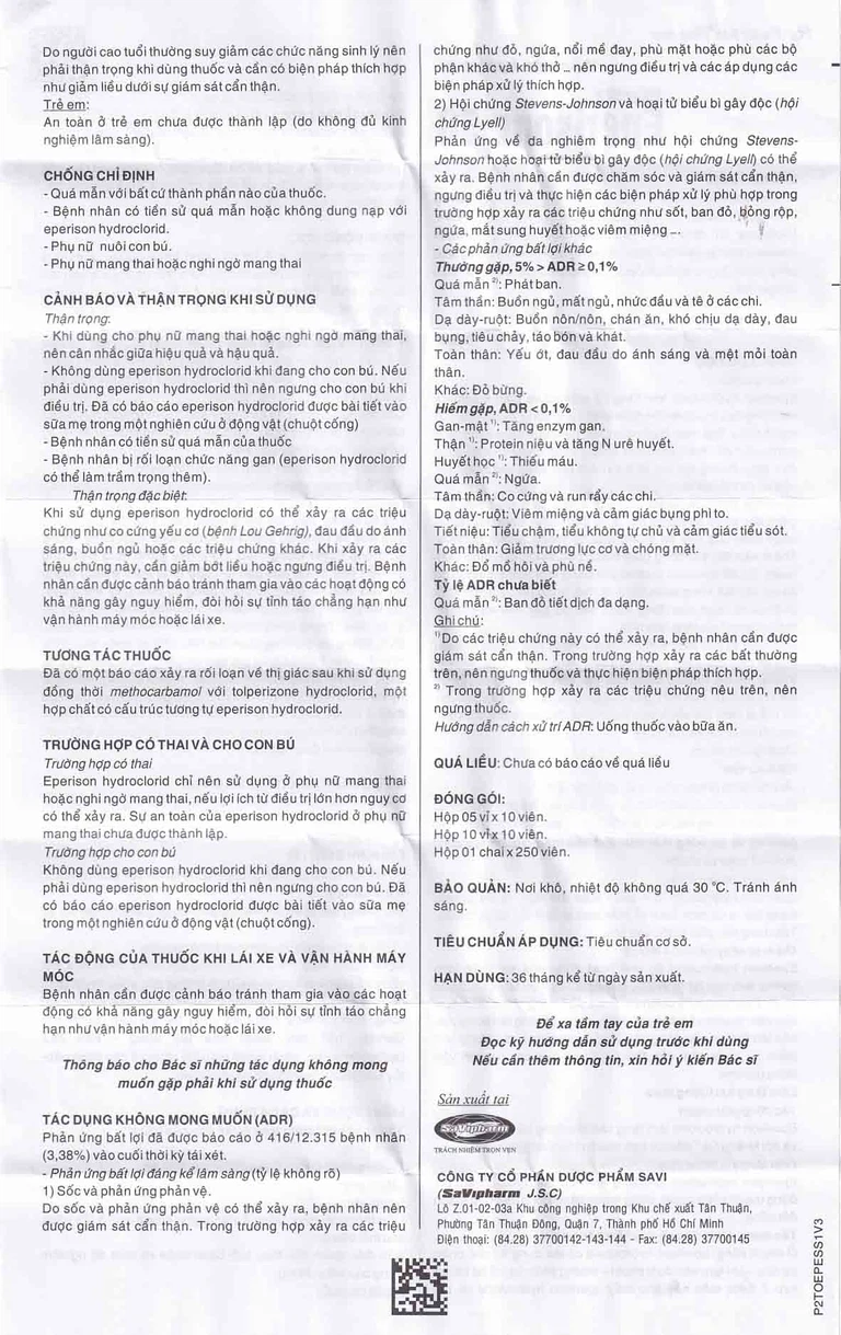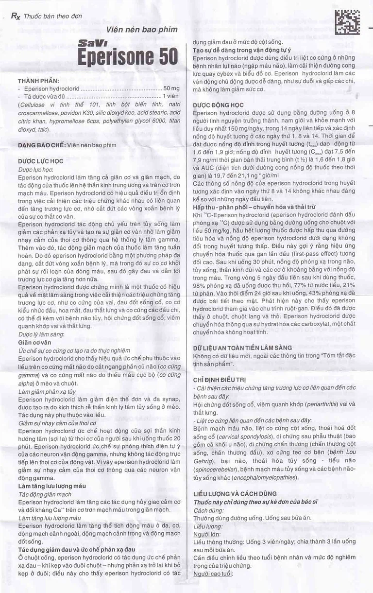 Eperisone của công ty cổ phần dược phẩm Sa Vi (Savipharm J.S.C), có thành phần chính là eperison hydroclorid. Đây là thuốc dùng để điều trị, cải thiện các triệu chứng làm tăng trương lực cơ và liệt co cứng.