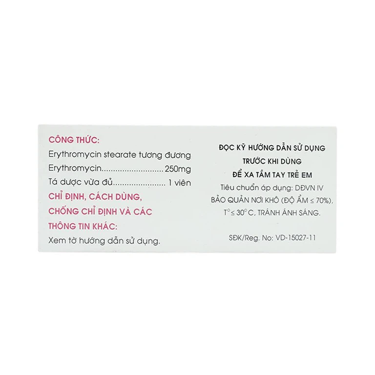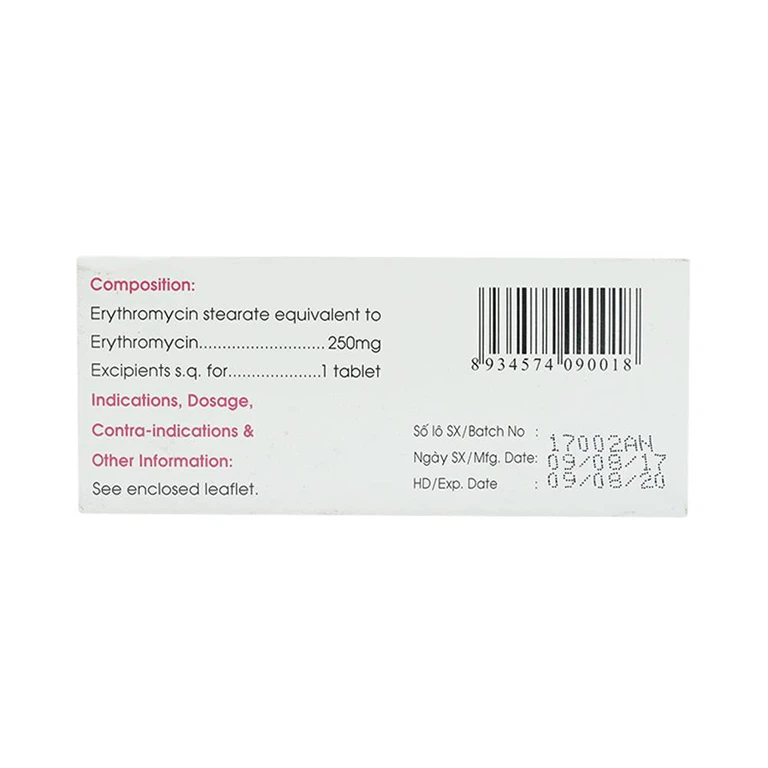 Tác dụng không mong muốn của thuốc: Thuốc thường dung nạp tốt và hiếm có các phản ứng không mong muốn nặng. Khoảng 5 – 15% người bệnh dùng erythromycin có tác dụng không mong muốn. Phổ biến nhất là các vấn đề tiêu hóa, đặc biệt với liều cao và sự kích ứng tại chỗ.