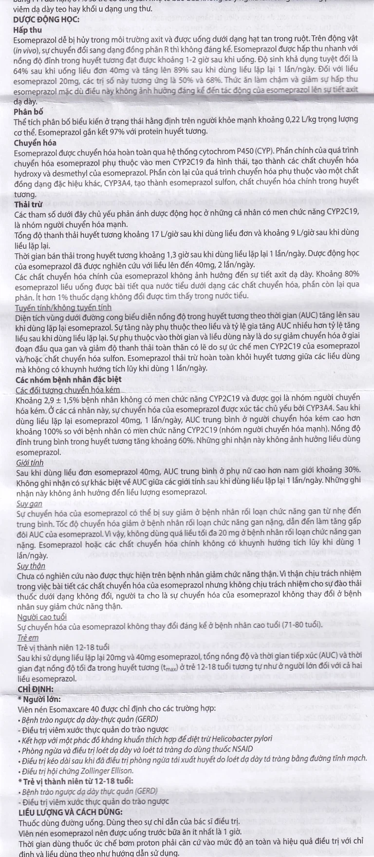 Trẻ vị thành niên 12-18 tuổi. Sau khi sử dụng liều lặp lại 20mg và 40mg esomeprazol, tổng nồng độ và thời gian tiếp xúc (AUC) và thời gian đạt nồng độ tối đa trong huyết tương (tmax) ở trẻ 12-18 tuổi tương tự như ở người lớn đối với cả hai liều esomeprazol.
