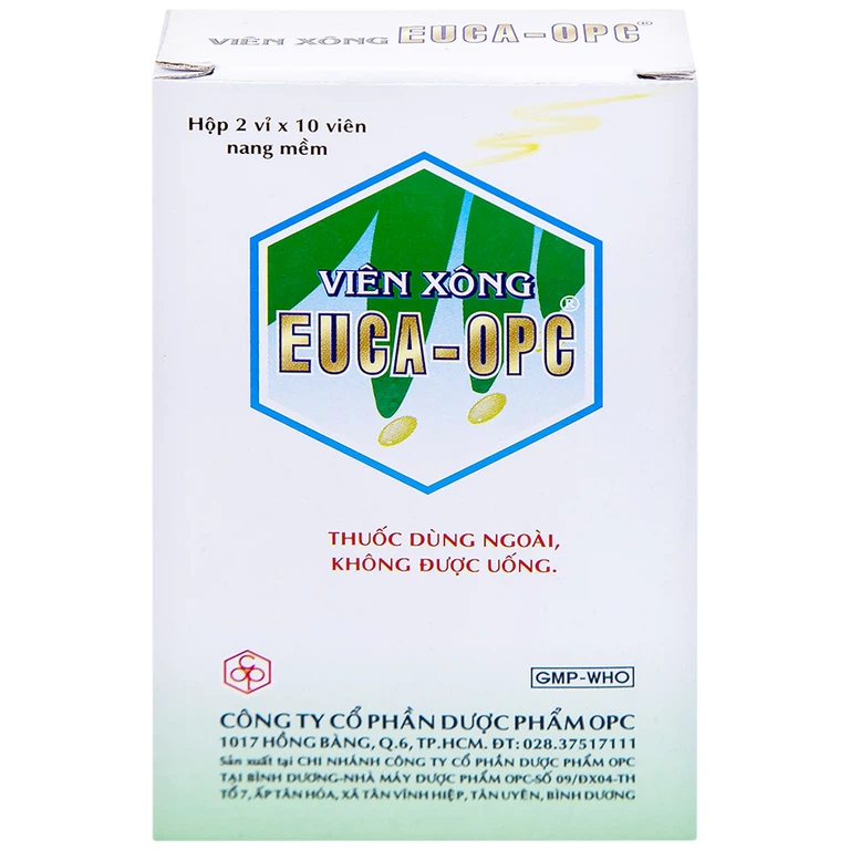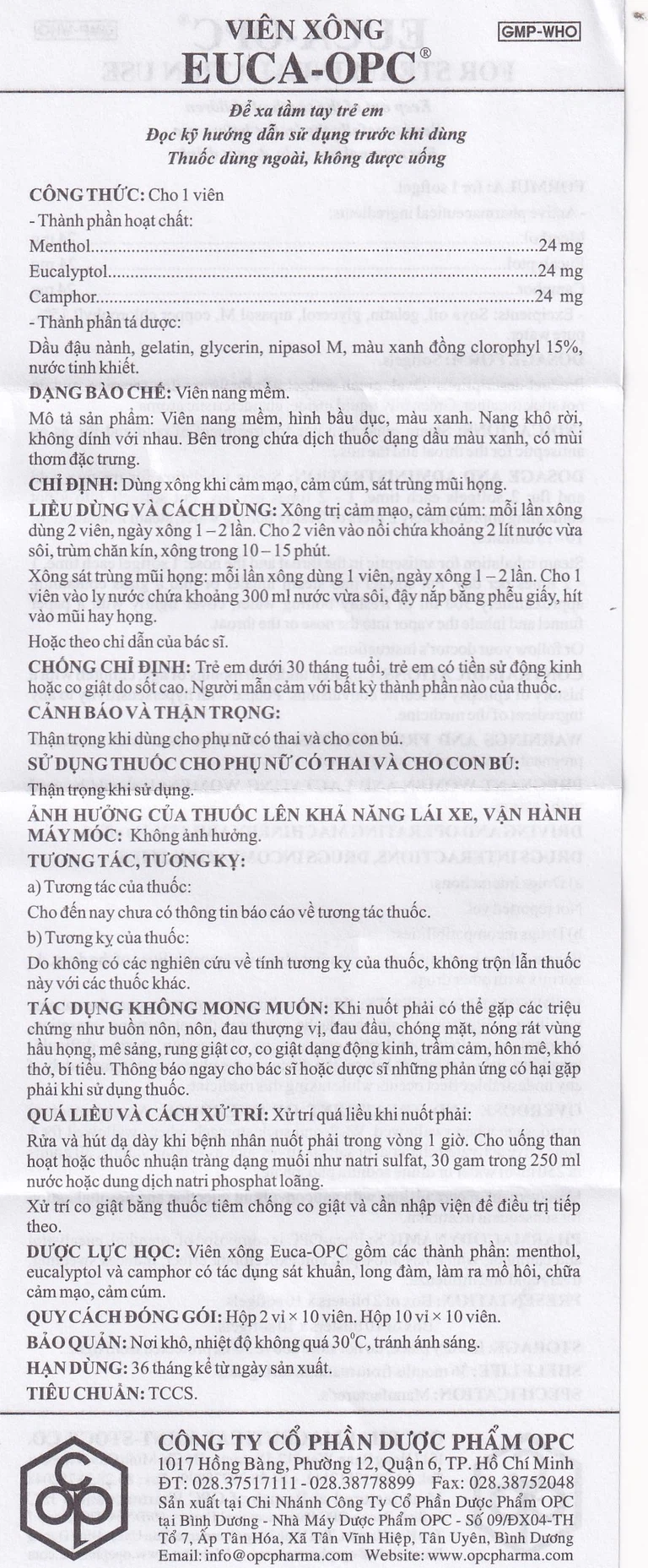Viên xông Euca-OPC® gồm các thành phần: Menthol, eucalyptol và camphor có tác dụng sát khuẩn, long đàm, làm ra mồ hôi, chữa cảm mạo, cảm cúm.