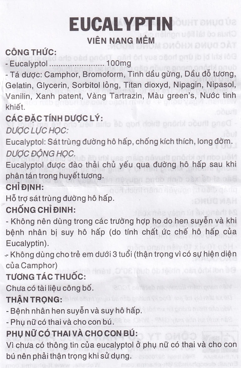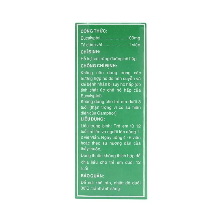 Không dùng trong các trường hợp ho do hen suyễn và khi bệnh nhân bị suy hô hấp (do tính chất ức chế hô hấp của Eucalyptin).