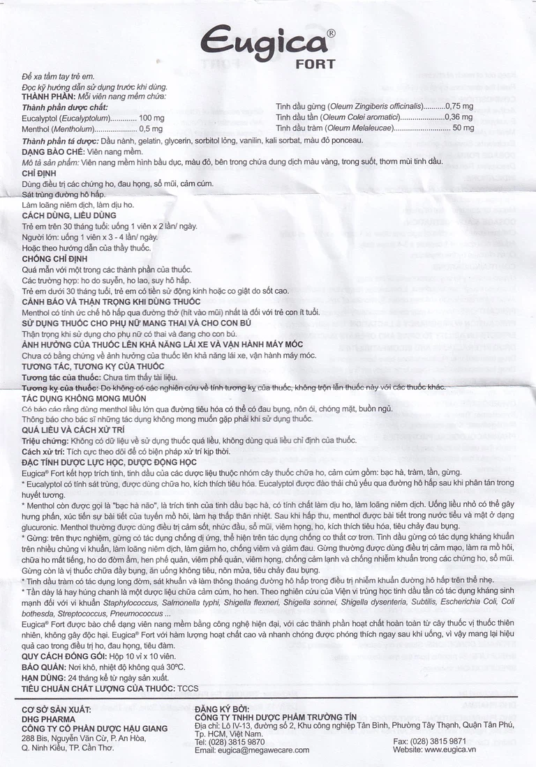 Eugica® Fort được bào chế dạng viên nang mềm bằng công nghệ hiện đại, với các thành phần hoạt chất hoàn toàn từ cây thuốc vị thuốc thiên nhiên, không gây độc hại. Eugica® Fort với hàm lượng hoạt chất cao và nhanh chóng được phóng thích ngay sau khi uống, vì vậy mang lại hiệu quả cao trong điều trị ho, đau họng, tiêu đàm.