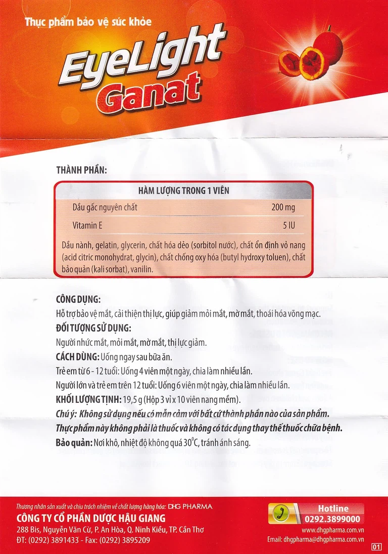 Eyelight Ganat chứa hai thành phần giàu dưỡng chất là dầu gấc và vitamin E.