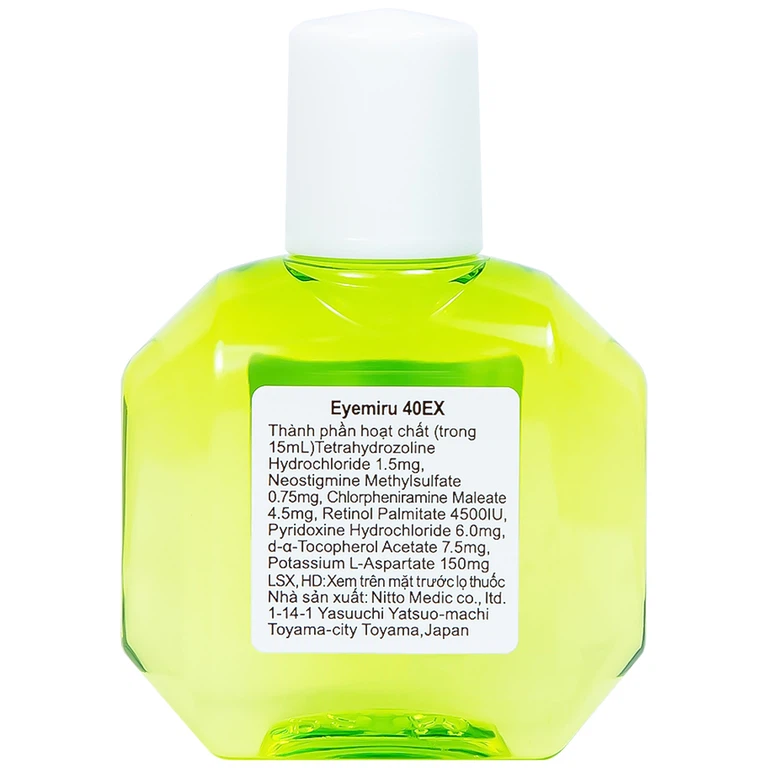 Thuốc EYEMIRU 40 EX là sản phẩm được sản xuất bởi Nitto Medic Co., Ltd. (Nhật Bản), thành phần chính là Tetryzoline hydrochloride; Neostingmine Methylsulfate; Chlorpheniramine Maleate; Retinol Palmitate; Pyridoxine hydrochloride; d-α -Tocoperol Acetate; Potassium L-Aspratate 150mg.Thuốc EYEMIRU 40 EX được bào chế dưới dạng dung dịch nhỏ mắt. Hộp 1 lọ 15ml.