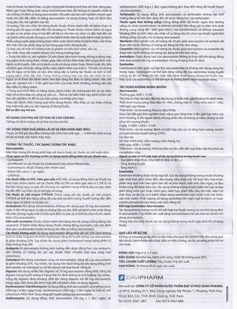 Warfarin : Một nghiên cứu vế tương tác thuốc giữa atorvastatin và warfarin đã được tiến hành: không có tương tác đáng kể trên lâm sàng.