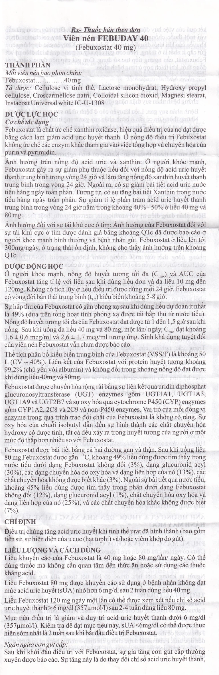 Liều khuyến cáo của febuxostat là 40 mg hoặc 80 mg/lần/ ngày.