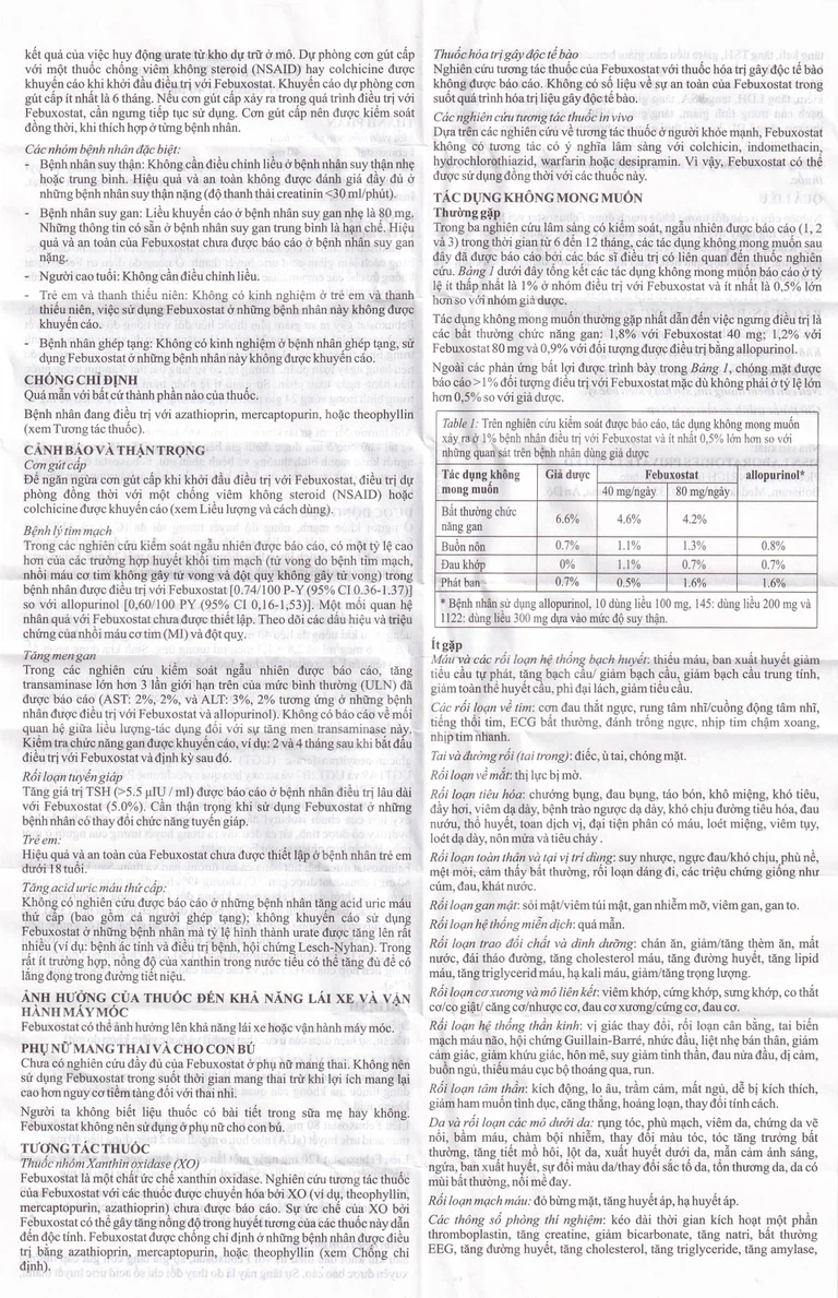 Bệnh lý tim mạch: Trong các nghiên cứu kiểm soát ngẫu nhiên được báo cáo, có một tỷ lệ cao hơn của các trường hợp huyết khối tim mạch (tử vong do bệnh tim mạch, nhồi máu cơ tim không gây tử vong và đột quỵ không gây tử vong) trong bệnh nhân được điều trị với febuxostat [0.74/100 P-Y (95% CI 0.36-1.37)] so với allopurinol [0,60/100 PY (95% CI 0,16-1,53)]. Một mối quan hệ nhân quả với febuxostat chưa được thiết lập. Theo dõi các dấu hiệu và triệu chứng của nhồi máu cơ tim (MI) và đột quỵ.