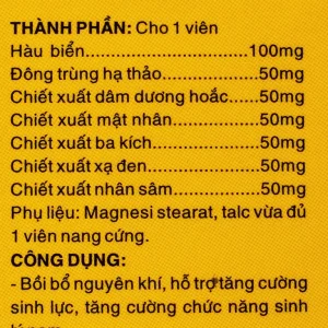 - Chiết xuất Dâm Dương Hoắc: Chứa hoạt chất Icariin, được biết đến với công dụng hỗ trợ giải phóng Nitric Oxide (NO), giúp tăng cường lưu thông máu và hỗ trợ chức năng cương dương.