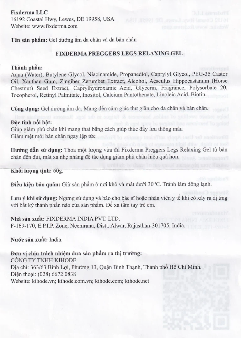 Thành phần của Gel Preggers Leg Relaxing 60g