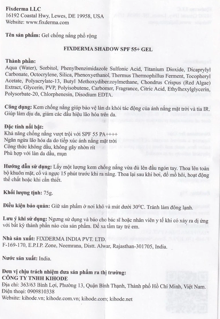 Thành phần của Kem chống nắng Fixderma Shadow SPF 55+ Gel 75g