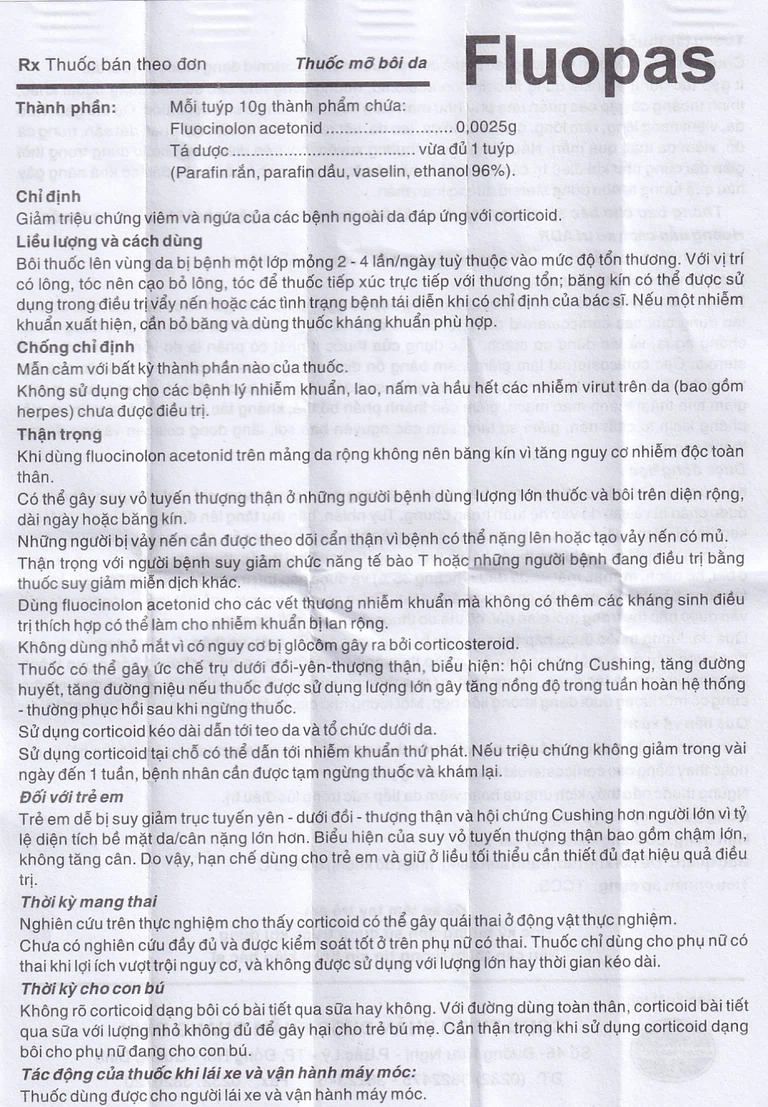 Fluopas 0,025% được chỉ định điều trị trong trường hợp: Giảm triệu chứng viêm và ngứa của các bệnh ngoài da đáp ứng với corticoid.