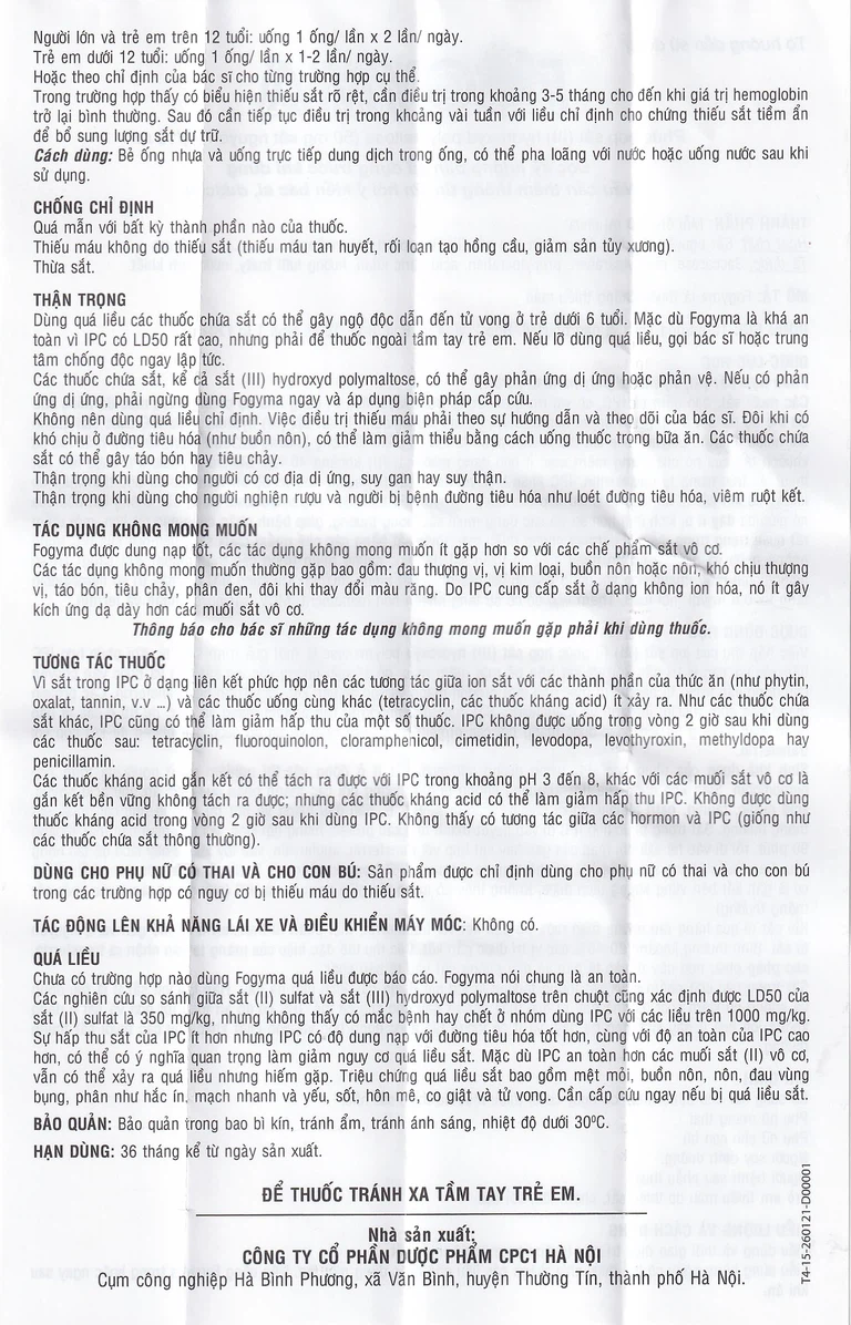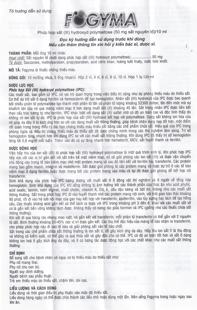 Thuốc Fogyma được sản xuất bởi Công ty Cổ phần Dược phẩm CPC1 Hà Nội, có chứa Sắt nguyên tố dưới dạng phức hợp sắt (III) hydroxyd polymaltose, được chỉ định để bổ sung sắt cho bệnh nhân có nguy cơ bị thiếu máu do thiếu sắt như phụ nữ mang thai, phụ nữ cho con bú, người suy dinh dưỡng, người bệnh sau phẫu thuật, trẻ em thiếu máu do thiếu sắt, chậm lớn, còi cọc.