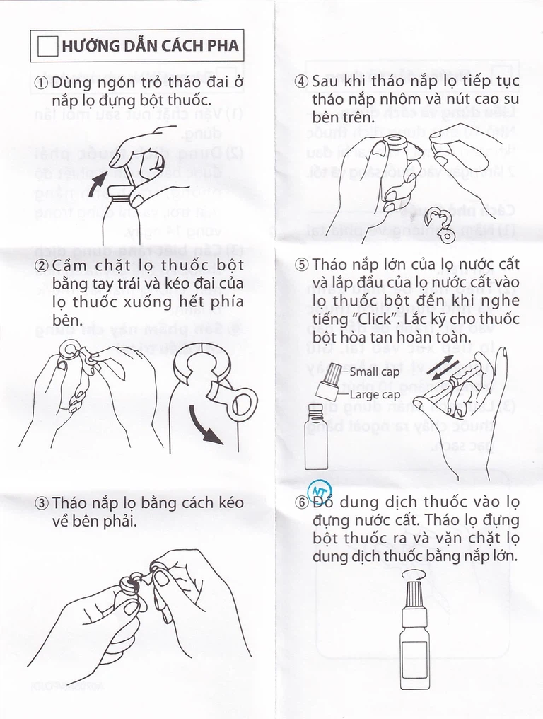Bước 5: Tháo nắp lớn của lọ nước cất và lắp đầu của lọ nước cất vào lọ thuốc bột đến khi nghe tiếng “Click”. Lắc kỹ cho thuốc bột hòa tan hoàn toàn.