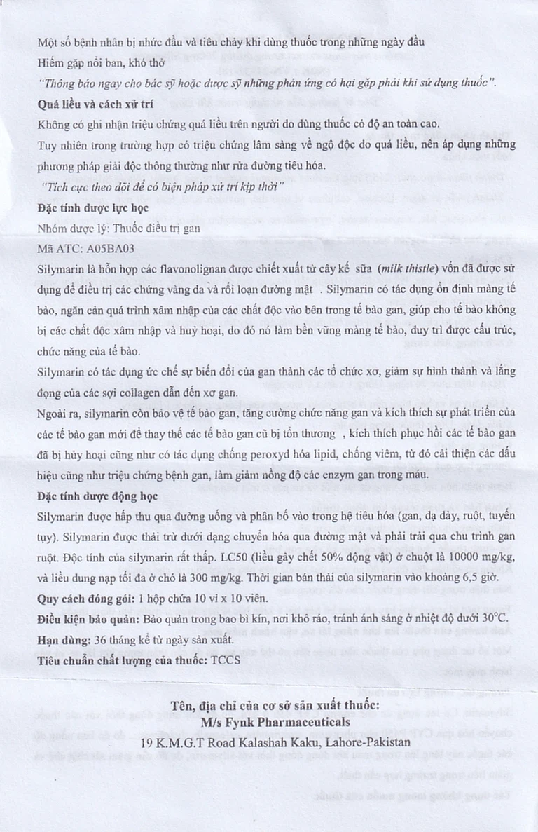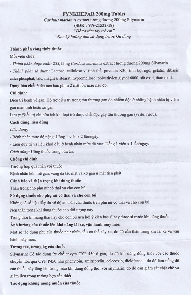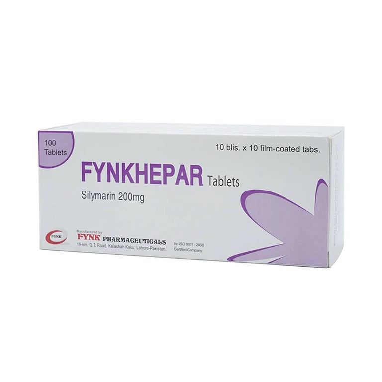 Fynkhepar 200mg của công ty Fynk Pharmaceuticals, Pakistan, có thành phần chính là silymarin. Đây là thuốc dùng để điều trị hỗ trợ các bệnh về gan do nhiễm độc như viêm gan mạn tính, xơ gan.