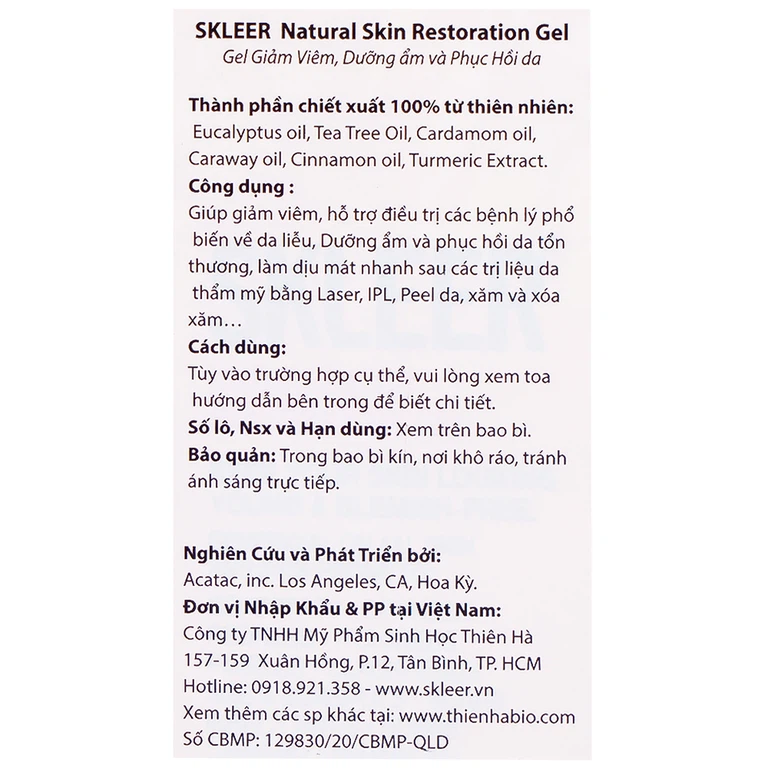 Skleer Natural Skin Restoration Gel có công thức độc quyền chứa 100% thành phần từ thiên nhiên.