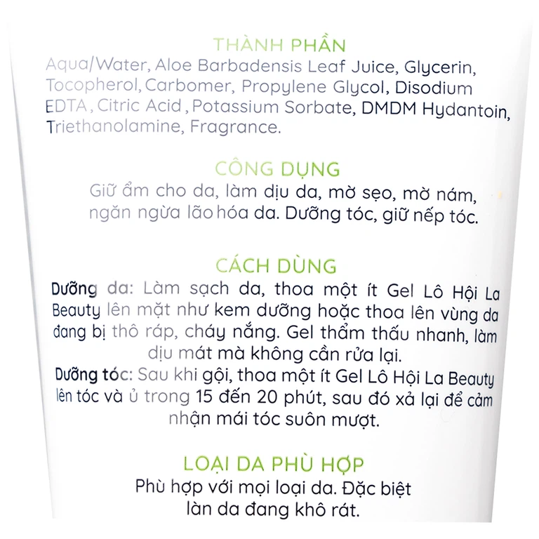 Dưỡng tóc: Sản phẩm không chỉ dưỡng da mà còn có khả năng làm dịu cảm giác ngứa trên da đầu, giảm tình trạng viêm da đầu và gàu. Gel Lô hội La Beauty còn có thể dùng làm mặt nạ tóc, cung cấp vitamin hỗ trợ quá trình tái tạo tế bào, giúp tóc phát triển khỏe mạnh, kích thích tóc mọc nhanh và ngăn ngừa rụng tóc.