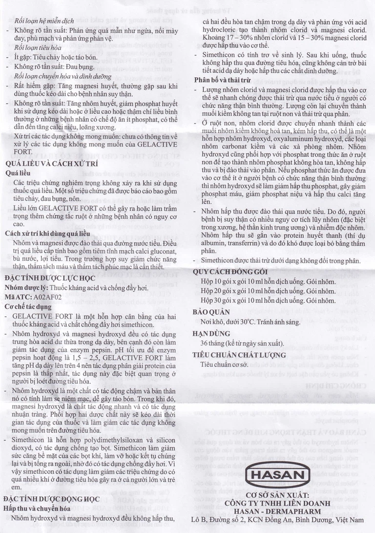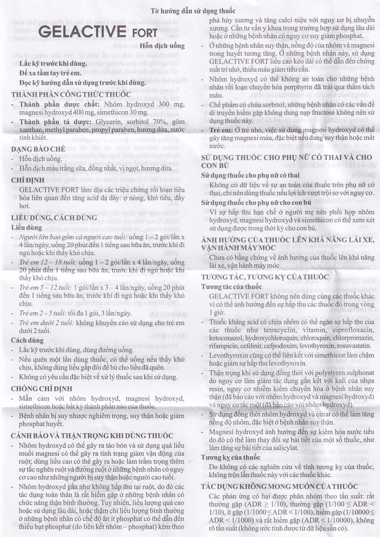 Gelactive Fort là hỗn hợp cân bằng giữa 2 tác nhân kháng acid Nhôm hydroxyd, Magnesi hydroxyd và chất chống đầy hơi Simethicon.