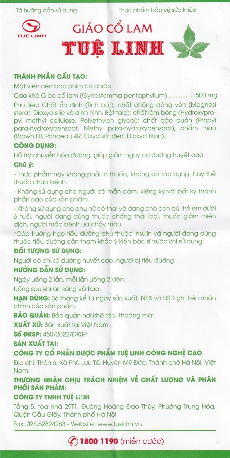 Giảo Cổ Lam Tuệ Linh có thành phần chính là cao khô giảo cổ lam , chứa hơn 100 loại saponin giúp hạ mỡ máu, giảm cholesterol, ngăn ngừa các bệnh về tim mạch và biến chứng tiểu đường. Sản phẩm còn giúp tăng cường lưu thông máu, hỗ trợ cải thiện chứng đau đầu, hoa mắt, chóng mặt.