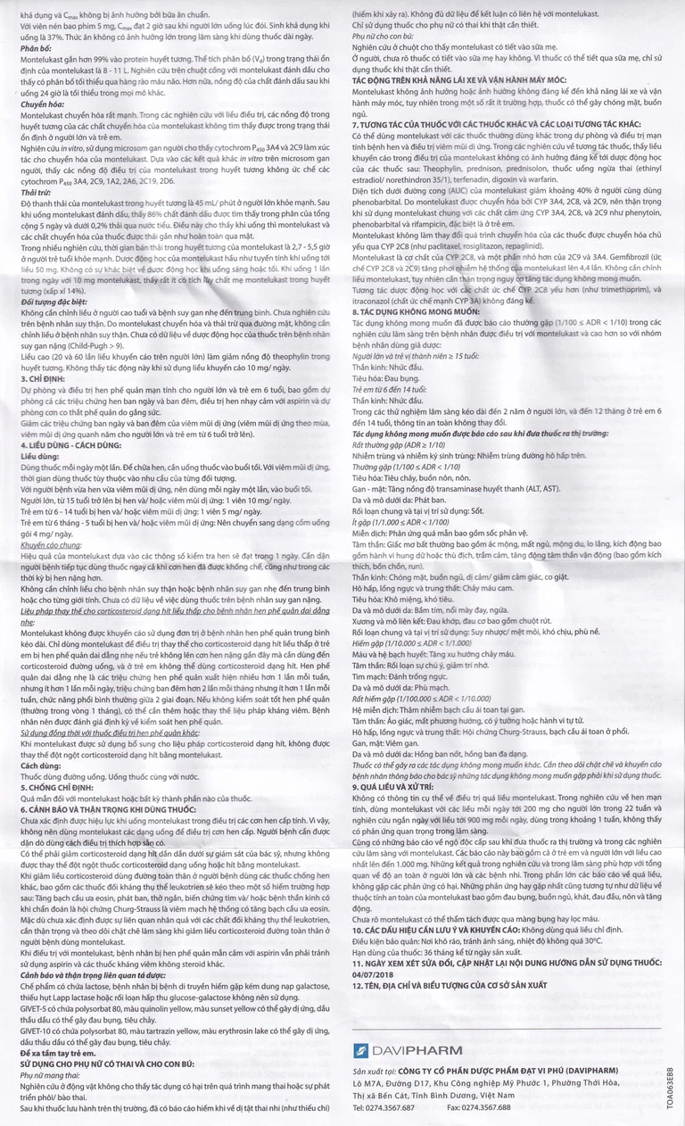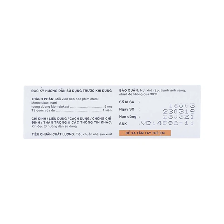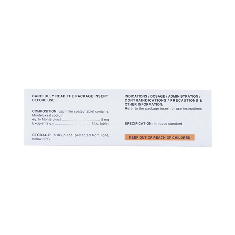 Sau khi uống, montelukast hấp thu nhanh và hầu như hoàn toàn. Với viên nén bao phim 5mg, Cmax đạt 2 giờ sau khi người lớn uống lúc đói. Sinh khả dụng khi uống là 37%.