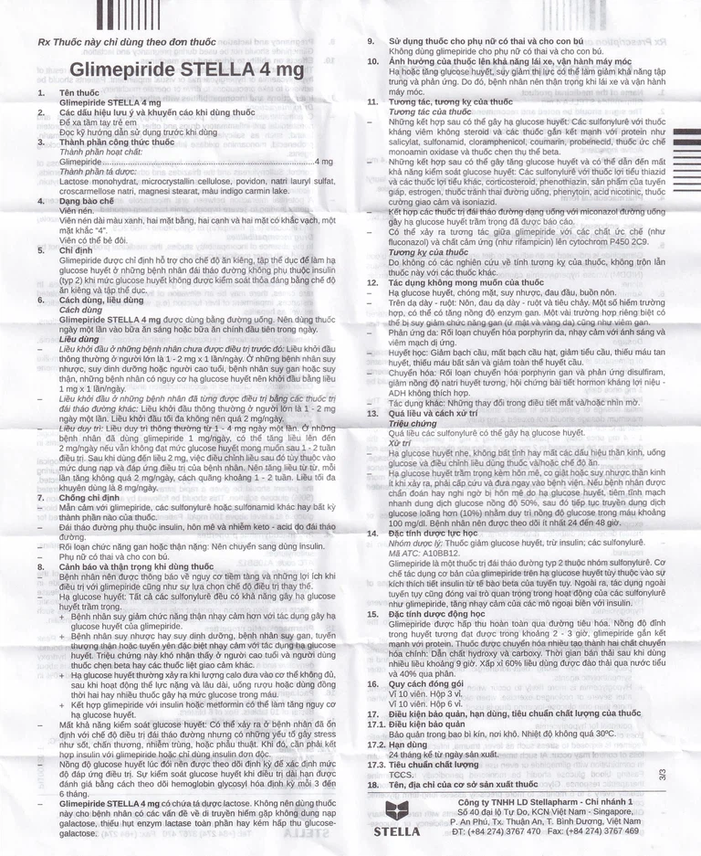 Thuốc Glimepiride 4mg của Công ty TNHH Liên doanh Stellapharm, thành phần chính Glimepiride 4mg là một loại thuốc được dùng để kiểm soát đường huyết cao ở những người bị bệnh tiểu đường tuýp 2, cùng với chế độ ăn uống và tập thể dục thích hợp. Glimepiride cũng có thể được sử dụng với thuốc trị tiểu đường khác.Việc kiểm soát đường huyết giúp ngăn ngừa tổn thương thận, mù lòa, các vấn đề thần kinh, dị tật chân tay và các rối loạn chức năng tình dục. Kiểm soát thích hợp bệnh tiểu đường cũng có thể làm giảm nguy cơ nhồi máu cơ tim hoặc đột quỵ. Glimepiride thuộc nhóm thuốc sulfonylurea. Glimepiride làm giảm đường huyết bằng cách làm giải phóng insulin tự nhiên trong cơ thể.