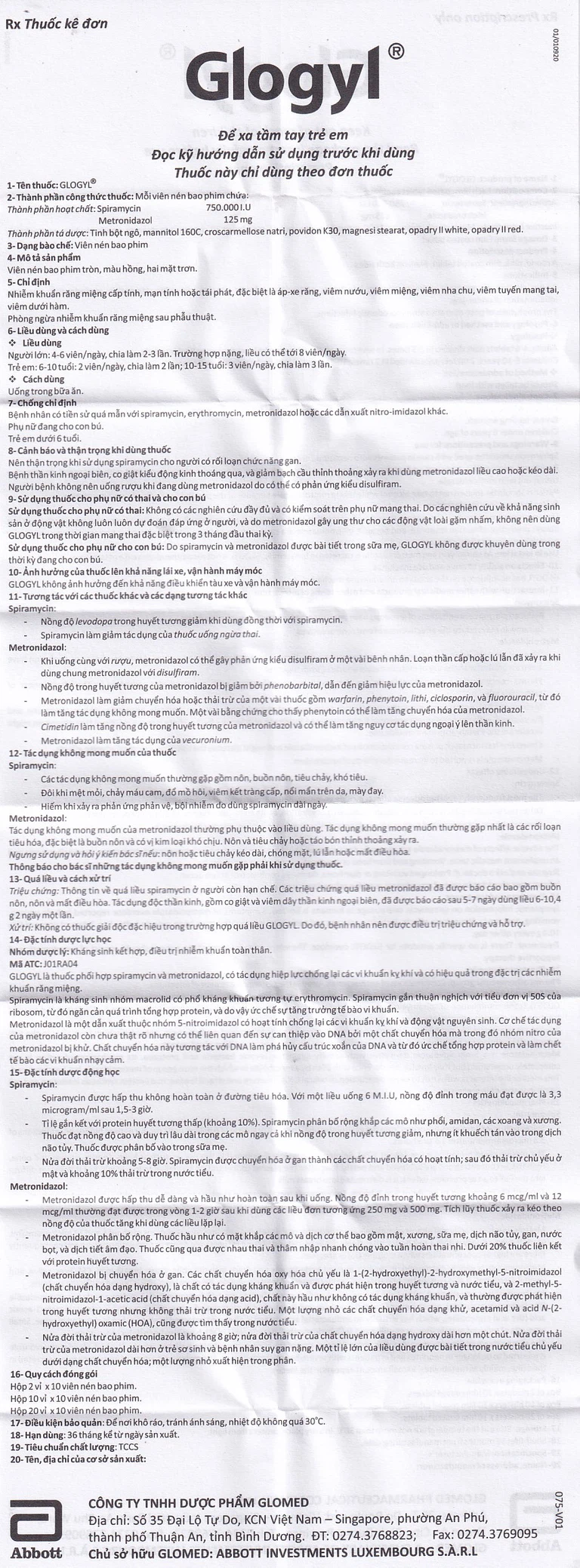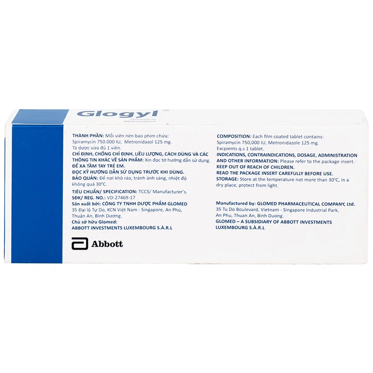 Glogyl là sản phẩm của Công ty TNHH Dược phẩm Glomed dùng điều trị nhiễm khuẩn răng miệng cấp tính, mạn tính hoặc tái phát, đặc biệt là áp-xe răng, viêm nướu, viêm miệng, viêm nha chu, viêm tuyến mang tai, viêm dưới hàm và phòng ngừa nhiễm khuẩn răng miệng sau phẫu thuật.