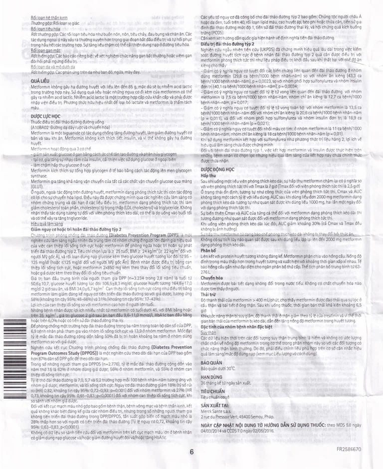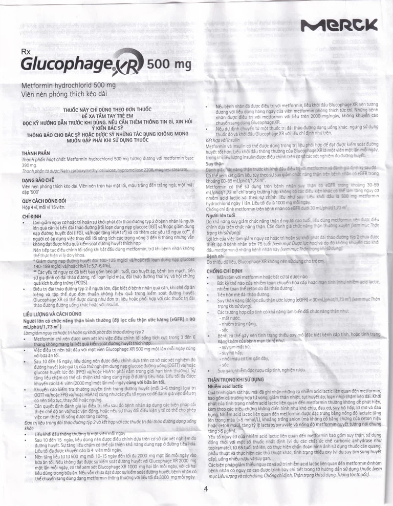 Glucophage Xr 500mg của Công ty dược phẩm Merck Sante, thành phần chính metformin hydrochloride, là thuốc dùng để làm giảm nguy cơ hoặc trì hoãn sự khởi phát đái tháo đường type 2 ở bệnh nhân là người lớn quá cân bị tiền đái tháo đường (rối loạn dung nạp glucose (IGT) và/hoặc giảm dung nạp đường huyết đói (IFG), và/hoặc tăng HbA1c) và có thêm các yếu tố nguy cơ, ở người có áp dụng việc thay đổi lối sống tích cực trong vòng 3 đến 6 tháng nhưng vẫn không đạt được hiệu quả kiểm soát đường huyết thích hợp. Thuốc còn được dùng để điều trị đái tháo đường type 2 ở người lớn, đặc biệt ở bệnh nhân quá cân, khi chế độ ăn kiêng và tập thể dục đơn thuần không hiệu quả trong kiểm soát đường huyết. Glucophage Xr 500mg được bào chế dưới dạng viên nén phóng thích kéo dài tròn hai mặt lồi, màu trắng đến trắng ngà, một mặt dập “500”. Một hộp 04 vỉ x 10 viên. Mỗi viên chứa 500mg metformin hydrochloride.