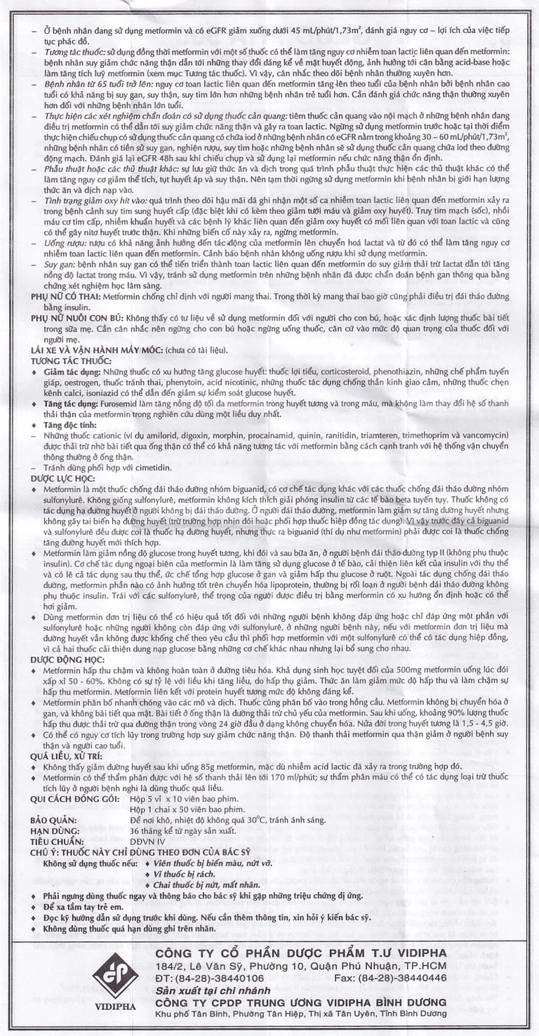 Tương tác thuốc: Sử dụng đồng thời metformin với một số thuốc có thể làm tăng nguy cơ nhiễm toan acid lactic liên quan đến metformin. Bệnh nhân suy giảm chức năng thận dẫn tới những thay đổi về mặt huyết động, ảnh hưởng tới cân bằng acid – base hoặc làm tăng tích lũy metformin. Vì vậy, cân nhắc theo dõi bệnh nhân thường xuyên hơn.