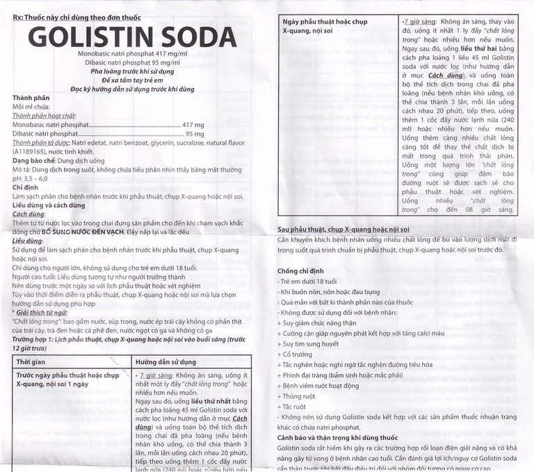 Soda giảm triệu chứng táo bón Golistin Soda 45 ml của Công ty Cổ phần Dược phẩm Cpc1 Hà Nội, thành phần chính chứa monobasic natri phosphat, dibasic natri phosphat, là thuốc dùng để trị táo bón.
