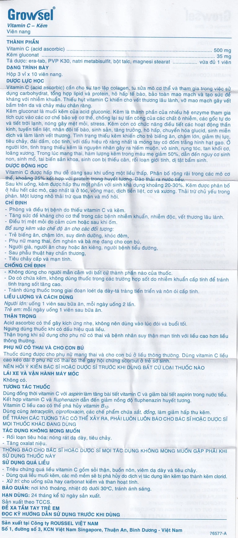 Thuốc Growsel 500mg của nhà sản xuất Roussel Việt Nam, với thành phần hoạt chất bao gồm Vitamin C (acid ascorbic) 500mg, Kẽm gluconat 35mg, được chỉ định trong các trường hợp phòng và điều trị bệnh do thiếu vitamin C và kẽm, điều trị mệt mỏi sau khi ốm hoặc cảm cúm. Ngoài ra thuốc còn giúp cơ thể tăng sức đề kháng khi gặp phải các trường hợp bệnh nhiễm khuẩn, nhiễm độc hay vết thương lâu lành.