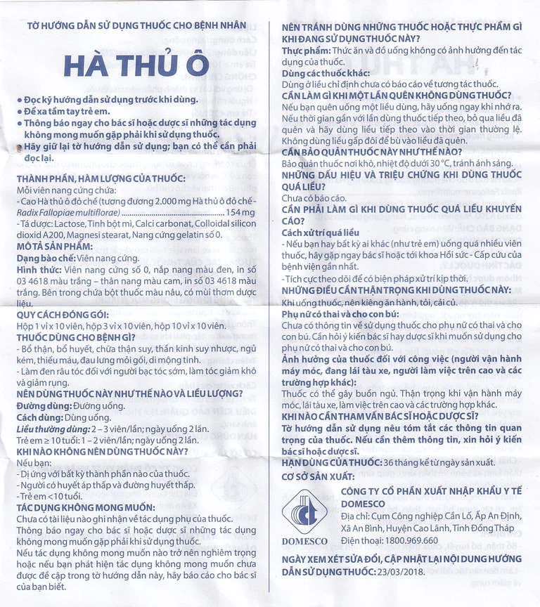 Hà Thủ Ô Domesco là sản phẩm của Công ty Cổ phần Xuất nhập khẩu Y tế Domesco, thành phần chính là cao hà thủ ô đỏ chế, là thuốc giúp bổ thận, bổ huyết, chữa thận suy, thần kinh suy nhược, ngủ kém, thiếu máu, đau lưng mỏi gối, di mộng tinh, làm đen râu tóc đối với người tóc bạc sớm, làm giảm tóc khô và giảm rụng. Viên nang cứng số 0, nắp nang màu đen, in số 03 4618 màu trắng – thân nang màu cam, in số 03 4618 màu trắng. Bên trong chưa bột màu nâu, có mùi thơm dược liệu.