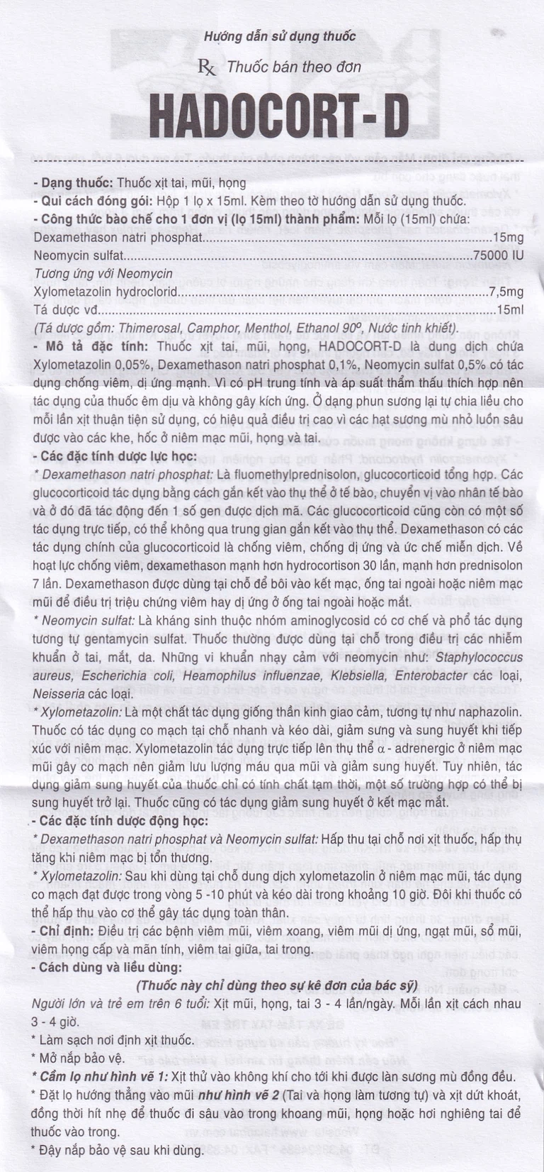 Cách dùng thuốc xịt tai, mũi họng Hadocort-D:
