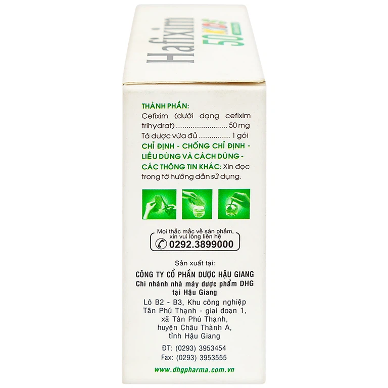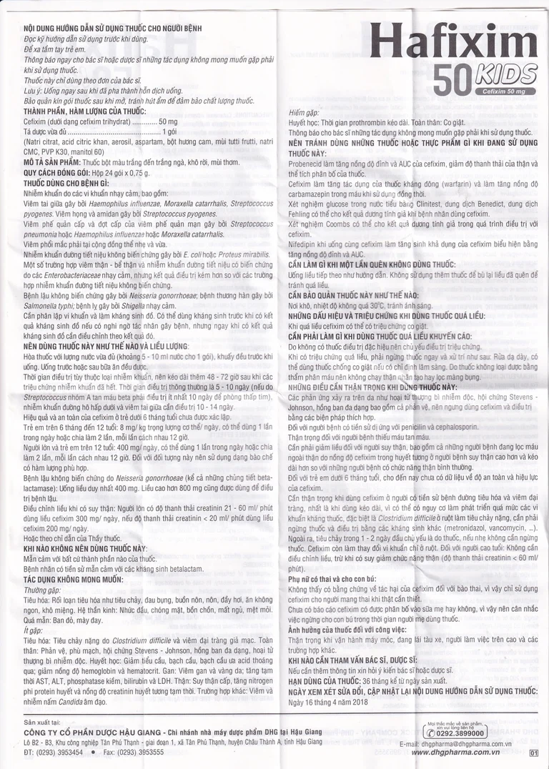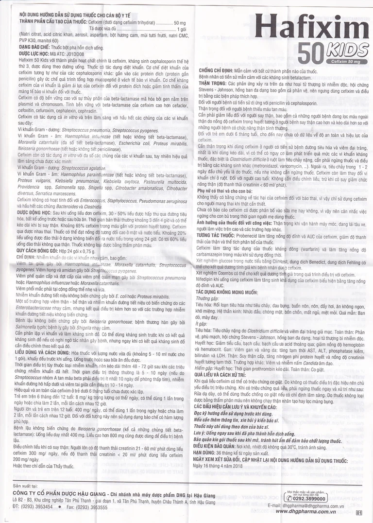 Hafixim 50 Kids được sản xuất bởi Công ty Cổ phần Dược Hậu Giang, với thành phần chính Cefixime, là thuốc dùng để điều trị các bệnh nhiễm khuẩn như viêm tai giữa, viêm phế quản cấp và đợt cấp của viêm phế quản mạn, viêm phổi cộng đồng thể nhẹ và vừa, nhiễm khuẩn đường tiết niệu không hoặc có biến chứng, bệnh lậu.