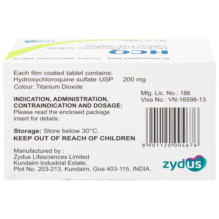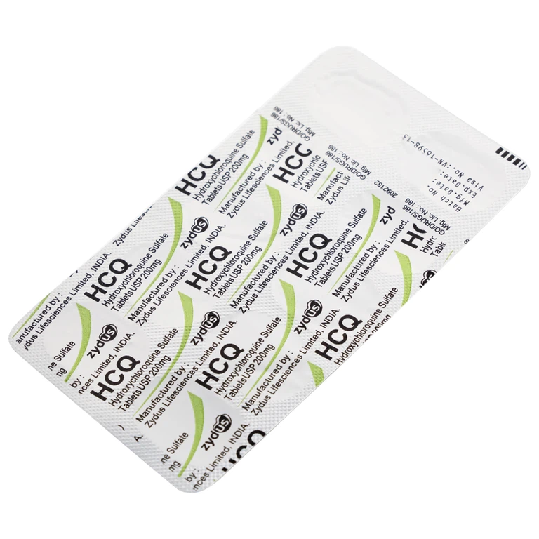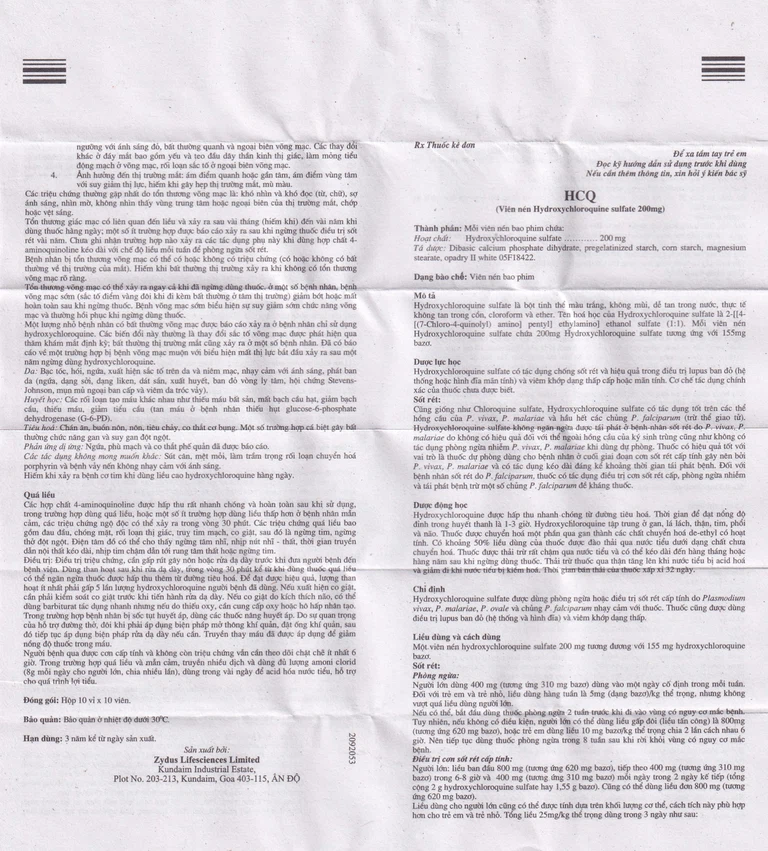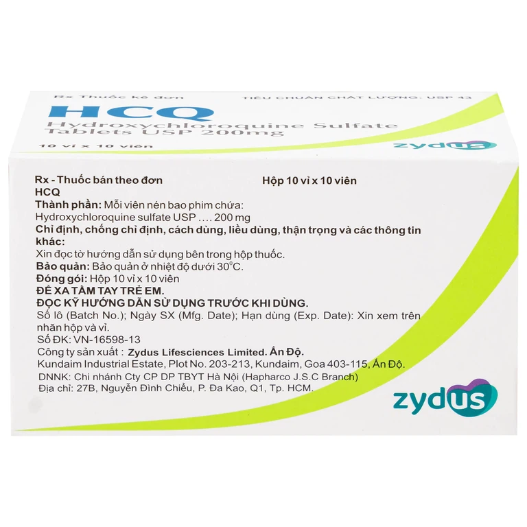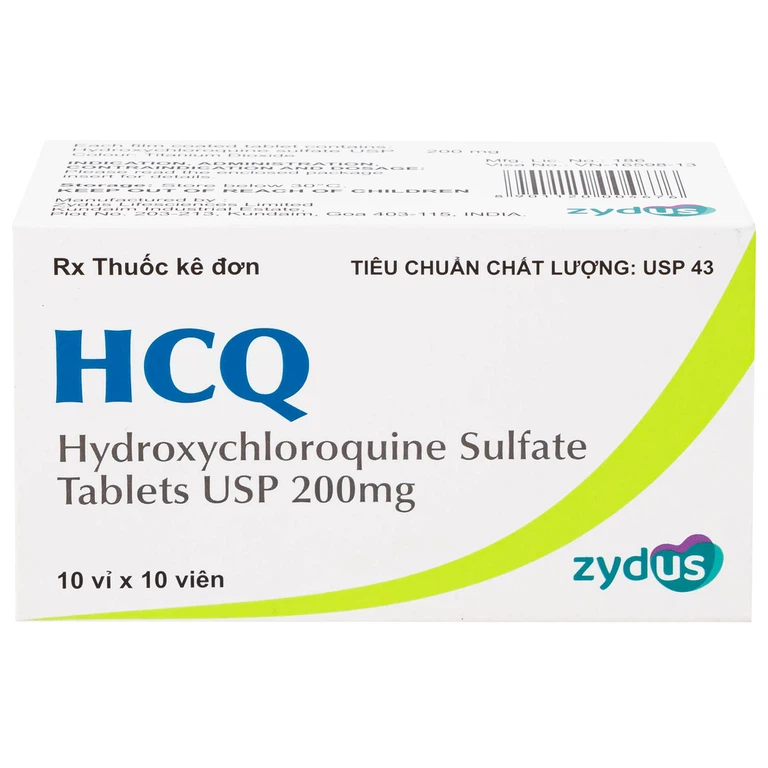 Thuốc HCQ là sản phẩm của Zydus Cadila, có thành phần chính là Hydroxychloroquine sulfate. Đây là thuốc được sử dụng để phòng ngừa hoặc điều trị sốt rét cấp tính do Plasmodium vivax, P.malariae, P.ovale và chủng P.falciparum nhạy cảm với thuốc; điều trị lupus ban đỏ (hệ thống và hình đĩa) và viêm khớp dạng thấp.