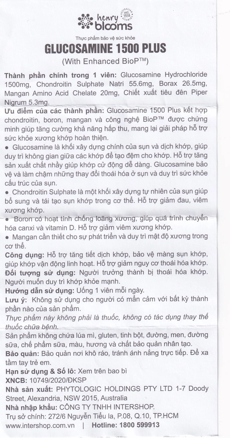Henry Blooms Glucosamine 1500 Plus hỗ trợ tăng tiết dịch khớp, bảo vệ màng sụn khớp, giúp khớp vận động linh hoạt. Hỗ trợ giảm nguy cơ thoái hóa khớp.
