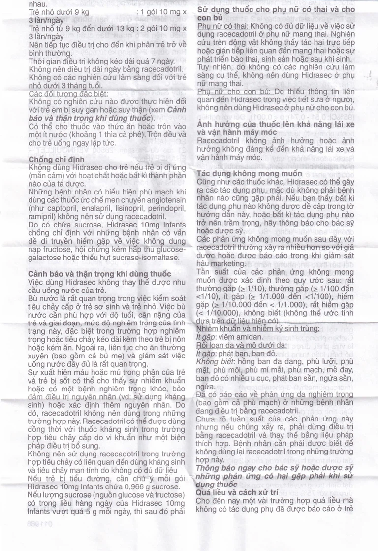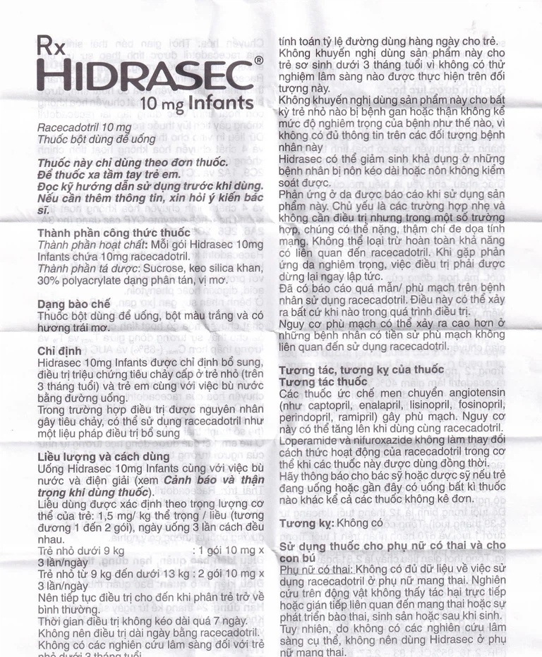Không nên sử dụng racecadotril trong trường hợp tiêu chảy có liên quan đến dùng kháng sinh và tiêu chảy mạn tính do không có đủ dữ liệu. Nếu trẻ bị tiểu đường, cần chú ý mỗi gói Hidrasec 10 mg Infants chứa 0,966 g sucrose. Nếu lượng sucrose (nguồn glucose và fructose) có trong liệu hàng ngày của Hidrasec 10 mg Infants vượt quá 5 g mỗi ngày, thì sau đó phải tính toán tỷ lệ đường dùng hàng ngày cho trẻ.