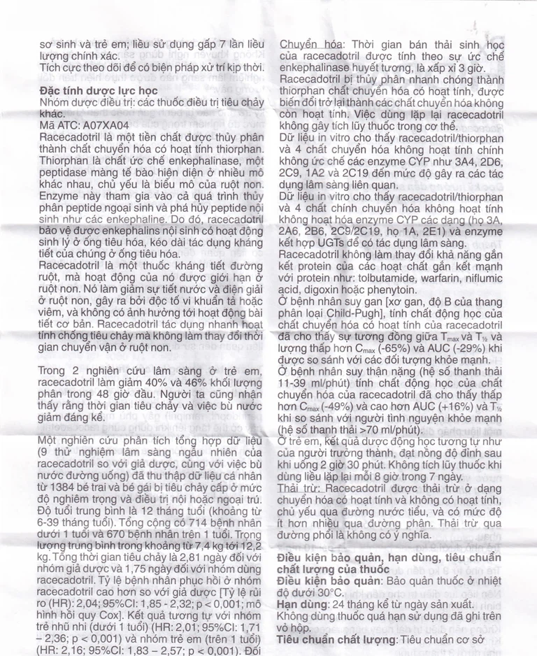 Đối với nghiên cứu trên bệnh nhân nội trú (n= 637 bệnh nhân), tỷ lệ trung bình lượng phân của nhóm dùng racecadotril so với giả dược là 0,59 (95% CI: 0,51 – 0,74); p < 0,001). Đối với nghiên cứu trên bệnh nhân điều trị ngoại trú (n = 695 bệnh nhân), tỷ lệ trung bình lượng phân của nhóm dùng racecadotril so với giả dược là 0,63 (95% CI: 0,47-0,85; p < 0,001).
