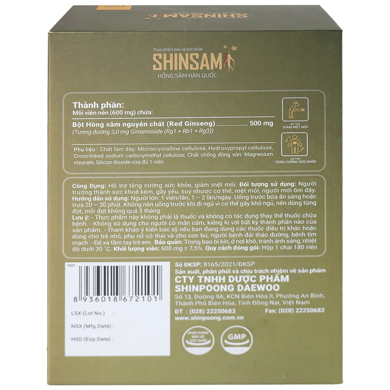 Mỗi viên hồng sâm của Shinsam chứa đến 500mg bột hồng sâm nguyên chất, đảm bảo nhu cầu chăm sóc sức khỏe hằng ngày. Việc ứng dụng công nghệ bào chế hiện đại giúp giữ nguyên hương vị thuần tự nhiên của hồng sâm, giảm thiểu thành phần phụ để hồng sâm phát huy hoàn hảo công dụng vốn có và bảo toàn ổn định trong điều kiện nóng ẩm của Việt Nam. Khi vào cơ thể, Hồng Sâm Shinsam dễ tan và hấp thụ nhanh, mang lại hiệu quả cao.