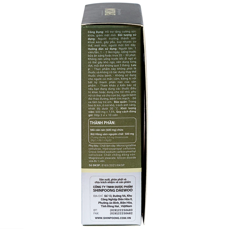 Mỗi viên hồng sâm của Shinsam chứa đến 500mg bột hồng sâm nguyên chất, đảm bảo nhu cầu chăm sóc sức khỏe hằng ngày. Việc ứng dụng công nghệ bào chế hiện đại giúp giữ nguyên hương vị thuần tự nhiên của hồng sâm, giảm thiểu thành phần phụ để hồng sâm phát huy hoàn hảo công dụng vốn có và bảo toàn ổn định trong điều kiện nóng ẩm của Việt Nam. Khi vào cơ thể, Hồng Sâm Shinsam dễ tan và hấp thụ nhanh, mang lại hiệu quả cao.