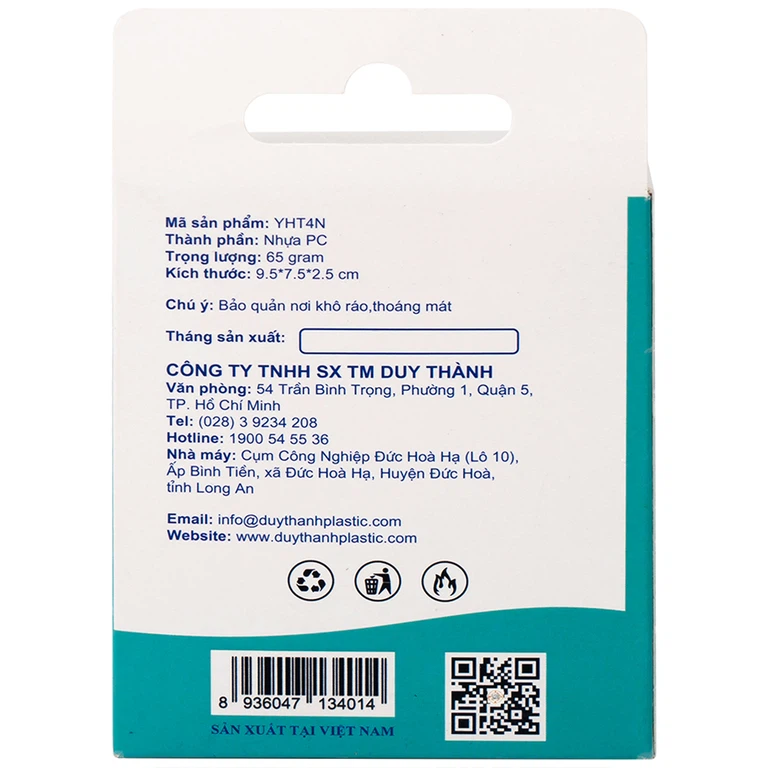 Hộp phân liều thuốc 4 ngăn màu trà là sản phẩm được sản xuất bởi Công ty TNHH SX-TM Duy Thành. Công ty có nhà máy đặt tại tỉnh Long An và trụ sở chính nằm ở quận 5, TP. HCM. Công ty TNHH SX-TM Duy Thành chuyên sản xuất các dòng sản phẩm nhựa y tế, sản phẩm phục vụ sức khoẻ như bộ giác hơi không dùng lửa và các dụng cụ massage. Ngoài ra, công ty cũng sản xuất nhiều mặt hàng nhựa gia dụng chất lượng cao.
