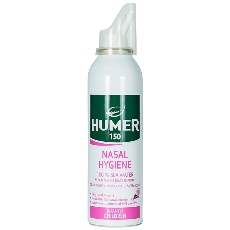 Xịt vệ sinh mũi HUMER 150 ml giúp vệ sinh khoang mũi hàng ngày, hỗ trợ điều trị hoặc phòng ngừa các bệnh tai mũi họng, hoặc để làm ẩm niêm mạc mũi trong trường hợp không khí khô.