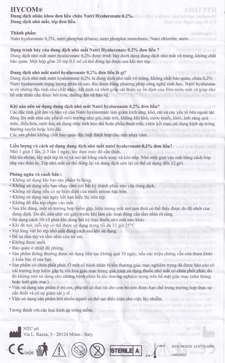 Dung dịch nhỏ mắt Hycom Sodium Hyaluronate 0.2% NTC Pharma giảm kích ứng, khô, rát mắt (20 ống x 0.5ml)