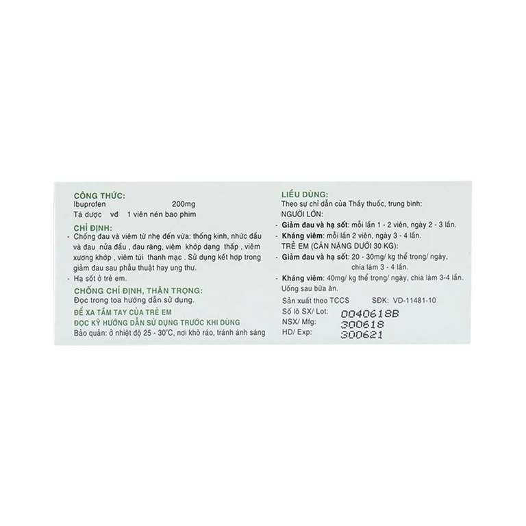 Ibuprofen 200 Nadyphar 10×10 của công ty Cổ phần Dược phẩm 29 – Nadyphar, thành phần chính ibuprofen, thuốc dùng để chống đau và viêm từ nhẹ đến vừa: Thống kinh, nhức đầu và đau nửa đầu, đau răng, viêm khớp dạng thấp, viêm xương khớp, viêm túi thanh mạc, sử dụng kết hợp trong giảm đau sau phẫu thuật hay ung thư, hạ sốt ở trẻ em.