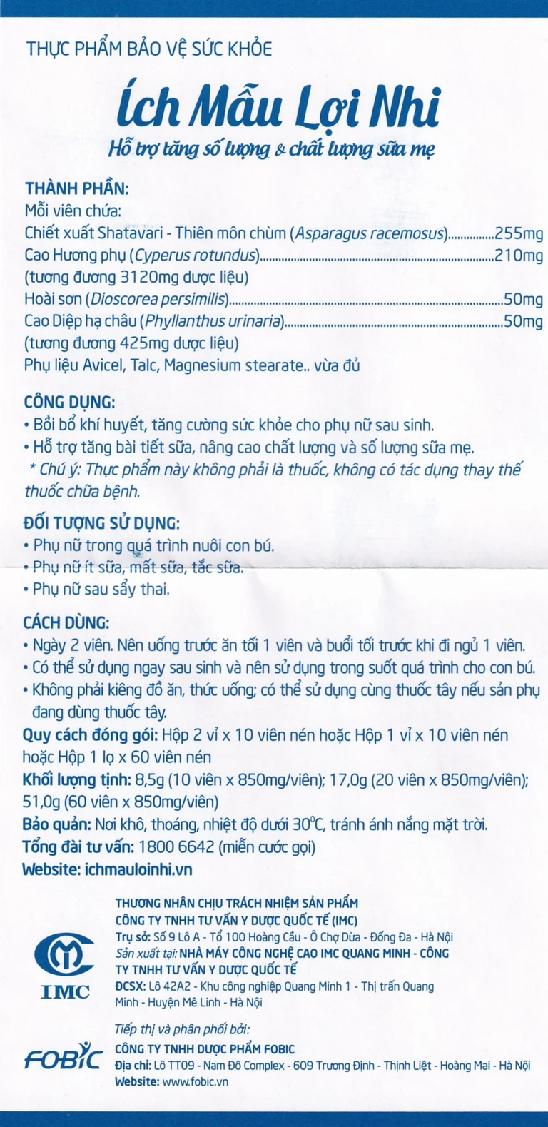 Sản phẩm Ích Mẫu Lợi Nhi được sản xuất bởi Công ty TNHH Tư vấn Y dược Quốc tế (IMC). Đây là doanh nghiệp tiên phong trong lĩnh vực nghiên cứu và sản xuất thực phẩm chức năng được bào chế từ thảo dược với nguyên liệu quý từ thiên nhiên kết hợp với công nghệ sản xuất hiện đại. Trải qua hơn 1 thập kỷ hình thành và phát triển, IMC luôn là doanh nghiệp đi đầu trong việc sản xuất ra những dòng thực phẩm chức năng cao cấp có nguồn gốc từ tự nhiên kết hợp với tinh hoa của khoa học và công nghệ hiện đại.