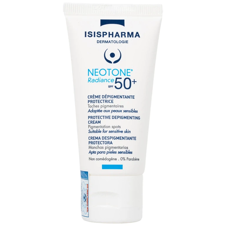 Kem chống nắng Isis Neotone Radiance SPF 50+ giúp chống nắng, làm mờ vết nám, trắng sáng da.